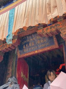 強巴佛殿,佛殿高30米,佛像高26.6米,共五層的一座鍍金佛像,一個鼻孔就容易容納一個七八歲的小孩,目前只能在一層拜佛;門口地上有一個順時針方向,寶石鑲嵌的萬字符號,也可以拜。由23萬公斤銅、7千多顆寶石、30多顆鑽石💎