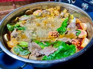 犛牛火鍋是指專用青藏高原犛牛肉為主料的一種具有非常鮮明青藏民族特色的火鍋,犛牛火鍋味道十足,嫩滑爽勁,有清湯原味,醬香味,在冷天裡是一道美味的佳餚。