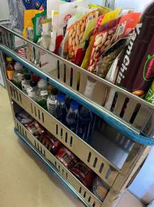 各式推車販賣犛牛肉乾、零食、水果切盤、飲料啤酒、泡麵
