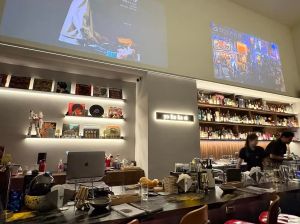 進門左手邊是調酒吧檯,螢幕是日本東京歌舞伎町一番街即時街況,現場同步日本氛圍。