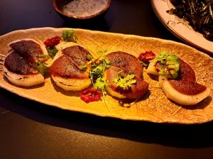 美食團團長Vic邀約,搭高鐵來到位在高鐵青埔站附近的「夜更かしBAR」🏮,是家位在青埔高鐵站附近步行可治的餐廳、青埔餐酒館、青埔酒吧,也是鐵板燒酒吧。氣氛超級、好很舒服,也裡還有DJ撥放音樂。這次聚會2位醫師1位護理師2位美食家,五個人到底吃了多少?每道菜都很好吃😋,感覺的出廚師的用心,店員推薦調酒,但今天有人微恙所以總共只喝了1瓶紅酒。