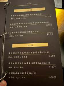 紅酒白酒酒單,單價比起台北的餐酒館,大約少了500元