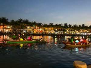 夜會安,秋盆河上穿梭的竹筏,點亮河面
