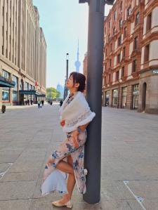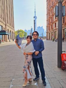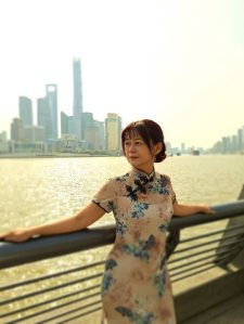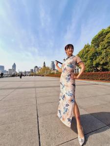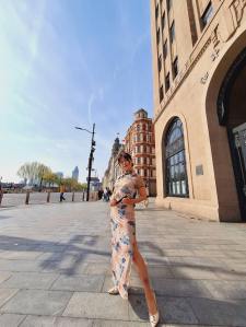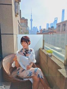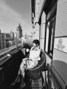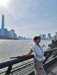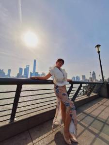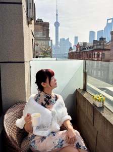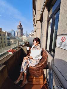 在酒店的江景陽台,後方是「東方明珠」
