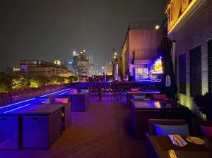 露台不僅可以看到陸家嘴、外灘和 黃浦江,還可以仰視和平飯店著名的19米墨綠金字塔型銅頂
