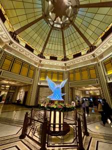 穹頂下方,是藝術玻璃雕刻的和平鴿,由藝術家施森彬創作