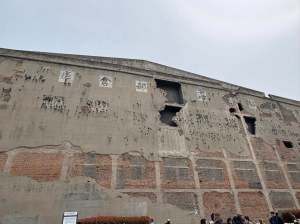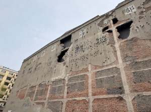 四行倉庫西牆簡介,西牆是當初進攻最密集的方向,牆上留有許多砲彈孔,和密布的槍彈孔。