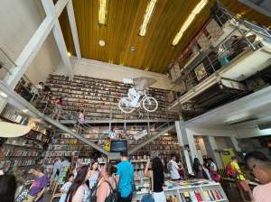 有意思的書局,有台拉風的飛天腳踏車