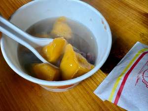 熱黃金餃,是地瓜餃+紅豆湯,香Q的地瓜餃,熱熱喝好舒服