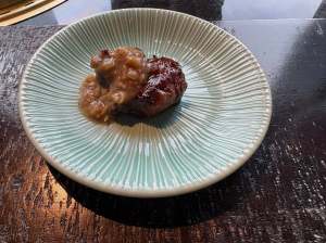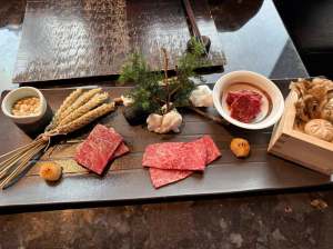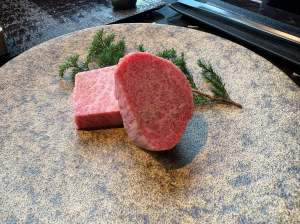 少脂肪的內腿、帶有美麗花紋的紐約客搭配著金山寺味噌,以及淋上特製五菇醬口感經典的橫膈膜