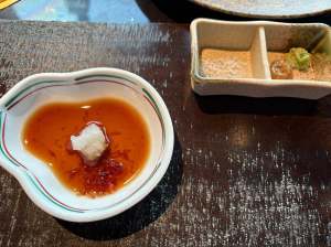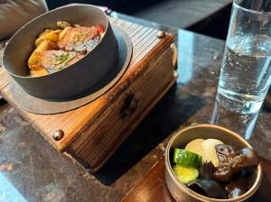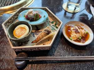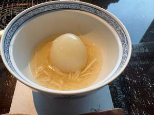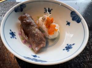 生牛肉搭配布拉塔起司、八丁味噌冬筍、半熟蛋。魚翅湯葉羹。
