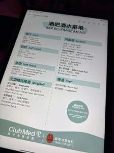 Club Med絕對是品酒人士的天堂,從起床睜開眼睛,直到睡覺前,有各式酒款讓你無限暢飲。供應的地點除了二座主餐廳,提供紅白葡萄酒和啤酒,最喜歡的是隨時隨地都可以到「森林吧」享用一杯(N杯)bartender現場製作的調酒!