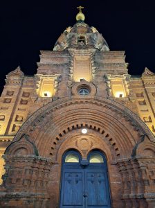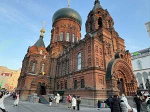 這座教堂始建於1907年,曾是遠東地區最大的東正教教堂,展現了拜占庭式的建築風格。教堂牆體使用清水紅磚,頂部為巨大的洋蔥頭穹頂,周圍錯落有致地分佈著四個較小的帳篷頂。